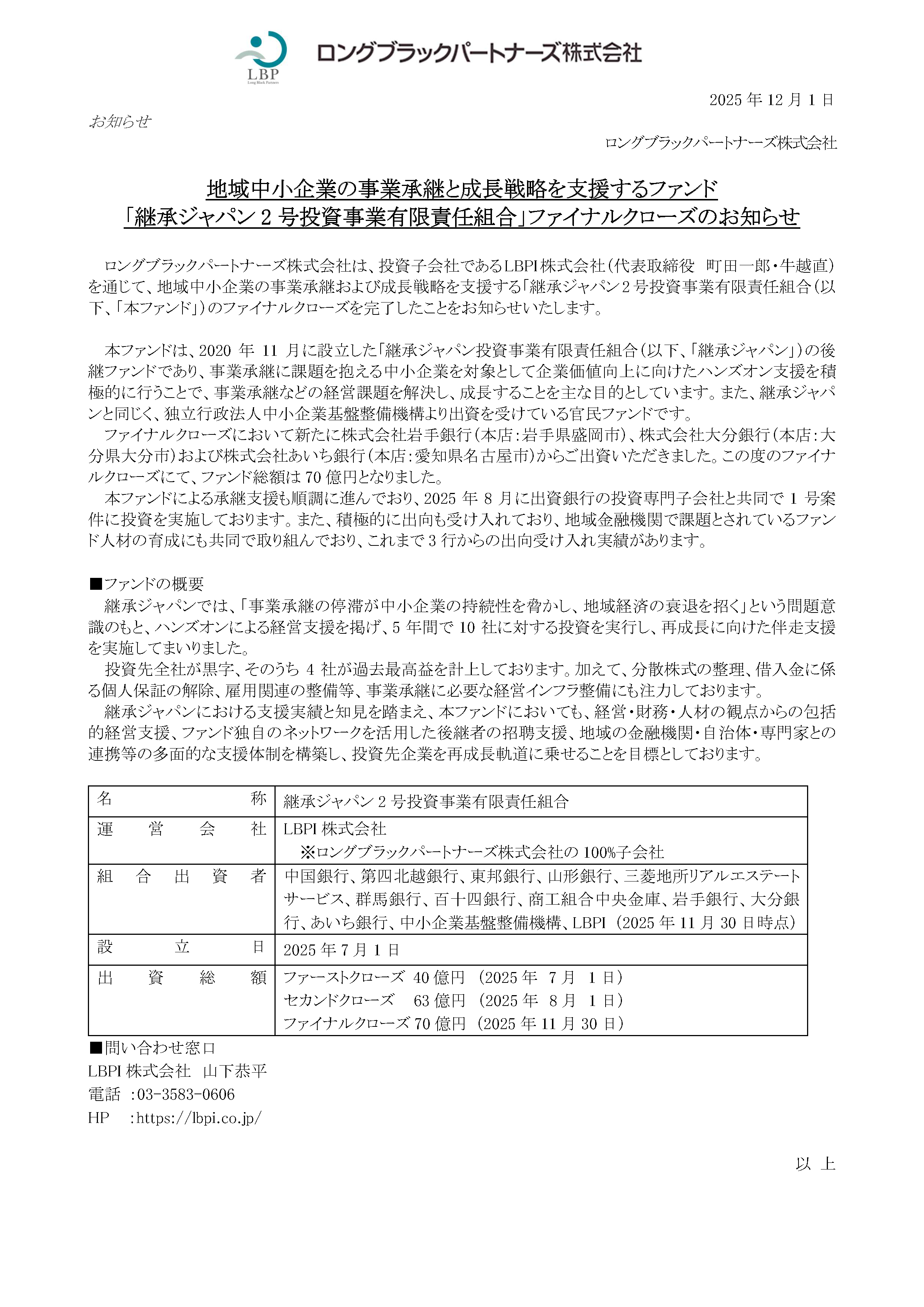 弊社は、投資子会社であるLBPI株式会社(代表取締役 町田一郎・牛越直)を通じて、地域中小企業の事業承継および成長戦略を支援する「継承ジャパン2号投資事業有限責任組合(以下、「本ファンド」)のファイナルクローズを完了したことをお知らせいたします。
