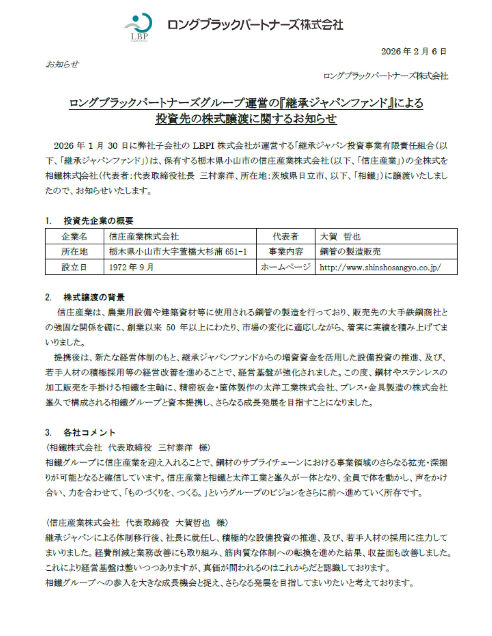 2026.02.06 弊社グループ会社 承継ジャパンファンドによる投資先の株式譲渡に関するお知らせ 2026年1月30日に弊社子会社のLBPI株式会社が運営する「継承ジャパン投資事業有限責任組合(以下、「継承ジャパンファンド」)は、保有する栃木県小山市の信庄産業株式会社(以下、「信庄産業」)の全株式を相鐵株式会社(代表者:代表取締役社長 三村泰洋、所在地:茨城県日立市、以下、「相鐵」)に譲渡いたしましたので、お知らせいたします。 詳細は、こちらをご覧ください。 前の記事 ニュース一覧